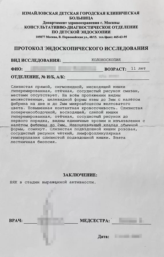 Там мне сделали колоноскопию впервые с 12 лет и подтвердили диагноз «язвенный колит». Врач нашел сужение в кишечнике и принял его за рак, чем сильно напугал мою маму. Мне же было неважно, какой диагноз: я хотела просто не просыпаться от боли каждые два часа и была согласна на любое лечение.
