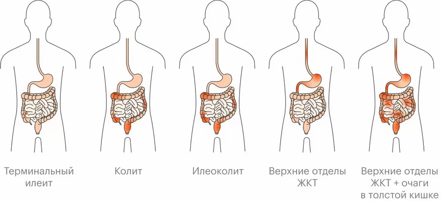 Поражение разных отделов желудочно-кишечного тракта при болезни Крона